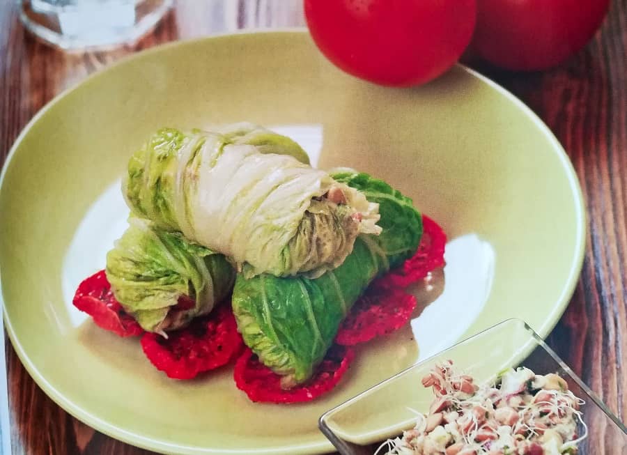 - Выложить голубцы на чипсы из помидоров (высушенных в течение 6 часов в дегидраторе).