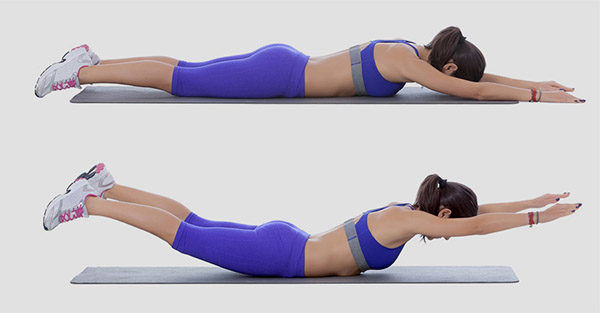 Лодочка. Укрепляет мышцы, выпрямляющие позвоночник и помогает избавиться от сутулости. Очень эффективное упражнение для школьников и офисных работников. Можно выполнять в динамике и в статике, задерживаясь в верхнем положении на 20-30 секунд.