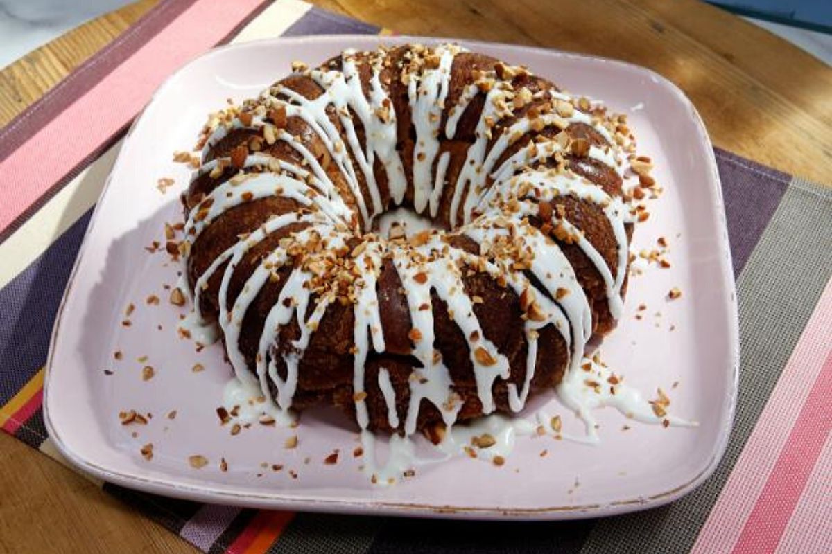 - Полить пирог глазурью и посыпать лесными орехами.