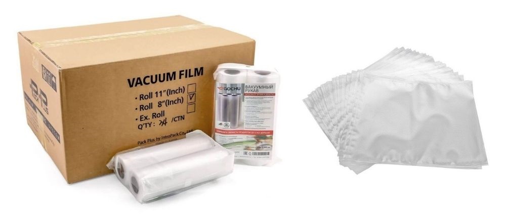Пакеты для су-вид можно приобрести в форме рулона с вакуумной пленкой — для нестандартных порций (на фото слева — пленка для вакуумного упаковщика Gochu). И в виде набора пакетов, как правило, по 100 штук в упаковке, что удобнее для домашнего использования (на фото справа — вакуумные пакеты Vac-star)