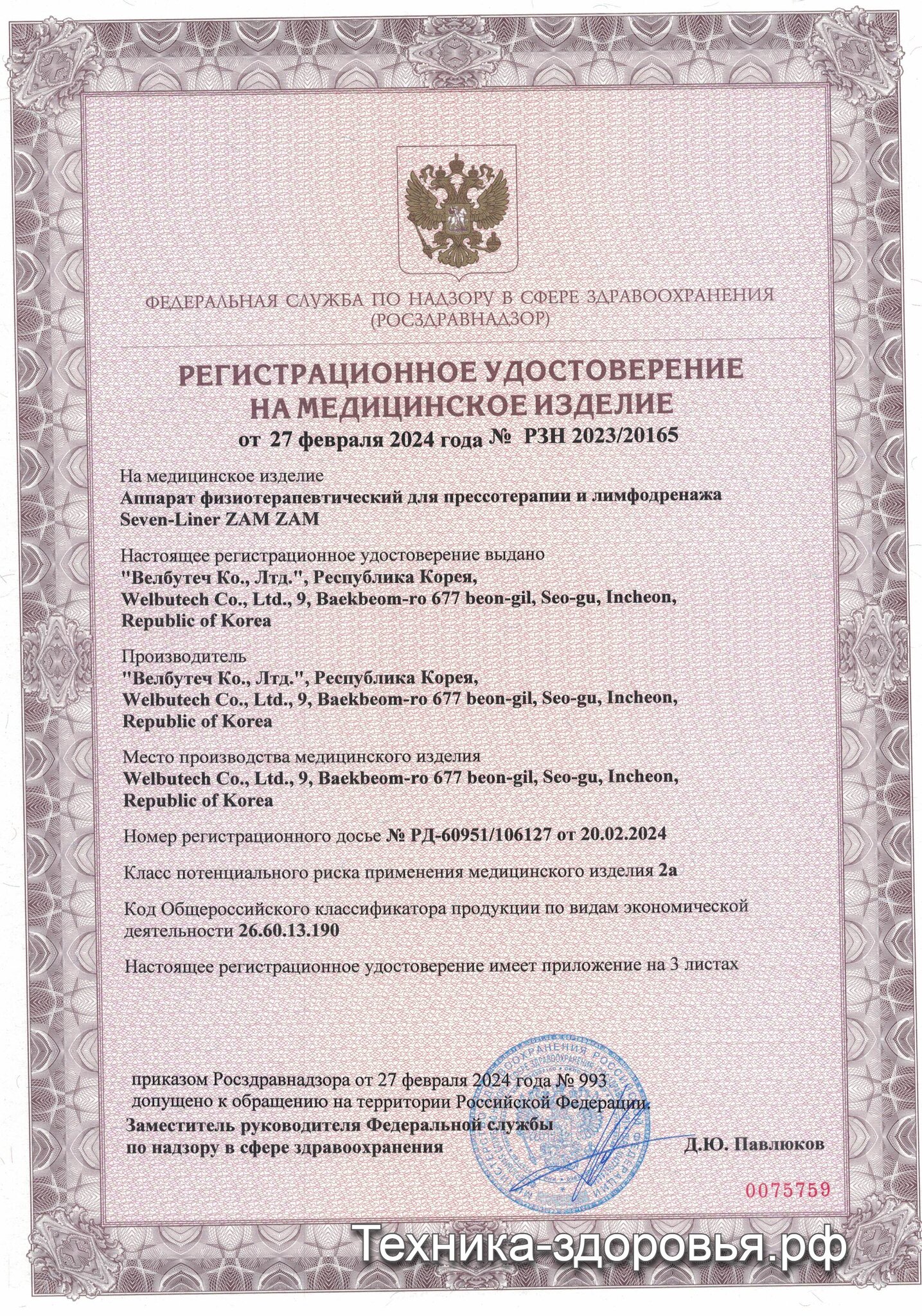 В России в реестр техники медицинского назначения могут быть включены только сертифицированные аппараты для проведения процедуры массажа. Продукция южнокорейского бренда WelbuTech соответствует этим требованиям. В 2023 году модели Zam-02, Zam 200S, Zam Luxury и Zam Sport стали первыми корейскими массажерами, получившими разрешение на продажу от Росздравнадзора. Этот сертификат подтверждает их эффективность, надежность и безопасность.
