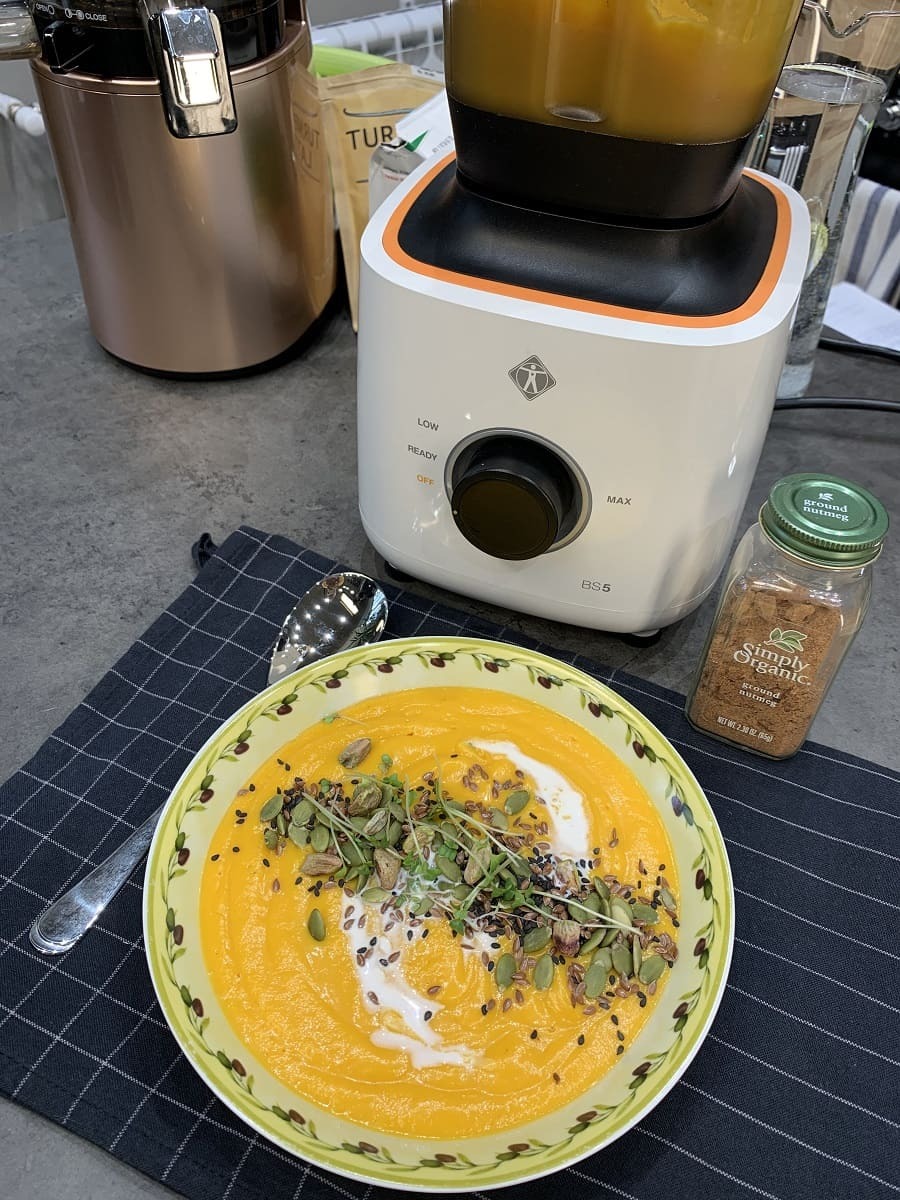 Практически все блюда готовятся в блендере 40-55 секунд, в случае с приготовлением горячего крем-супа время увеличивается до 6-8 минут. Рекомендуем сразу положить все ингредиенты и приправы, добавив немного воды, после сразу включить на максимальную скорость, температура в блендере поднимется до 65-70°С, если вы хотите более жидкий крем-суп, добавьте еще немного воды и еще раз включите блендер.