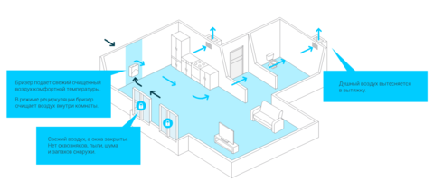 С помощью режима рециркуляции бризер прогоняет воздух в помещении, при этом очищая его от пыли и запахов. Этот прибор избавит вас от уличного шума, сквозняка, вредных газов - всего, с чем мы сталкиваемся, когда открываем окна.