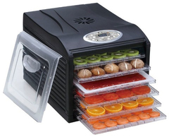 В верхней крышке дегидратора предусмотрены вентиляционные отверстия. Чтобы высушить продукты с большим содержанием жидкости (например томаты), можно снять прозрачную дверцу прямо в процессе работы. Это поможет быстро устранить излишнюю влагу и не допустить скисания. Благодаря возможности снять дверцу с работающего дегидратора можно сушить огромный ряд сочных продуктов, с которыми не справятся другие модели: это арбузы, персики, огурцы, помидоры и многое другое. Сушилка по-настоящему универсальна, она подходит для грибов, ягод, трав, нежирного мяса и рыбы. С ней легко изготовить сыроедческие хлебцы, пастилу и прочие сладости!