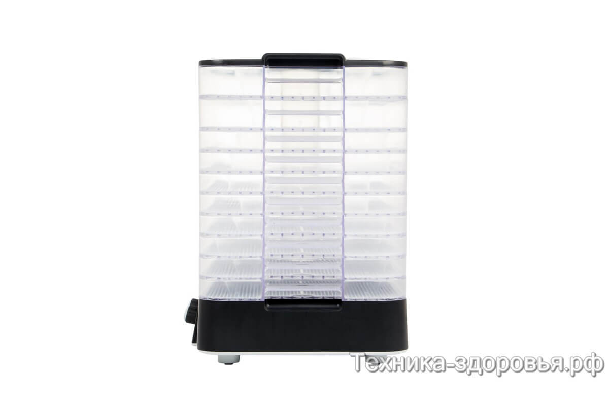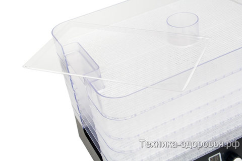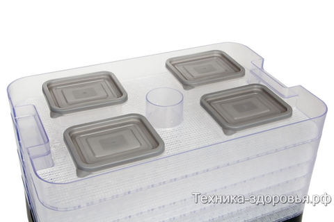 Лотки различаются по высоте и оснащены мелкоячеистыми пластиковыми сетками, предупреждающими просыпание небольших кусков продуктов. Прозрачные стены поддонов позволяют «на глаз» оценить готовность продуктов.