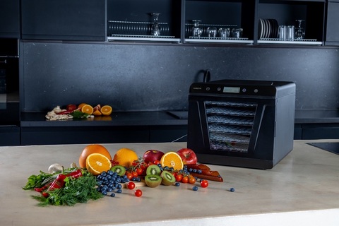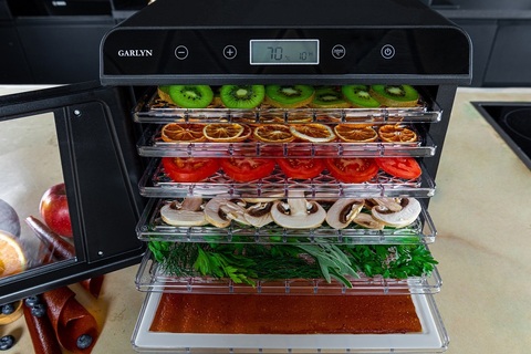 6 поддонов 30х32 см позволяют готовить большое количество порций любимых закусок и десертов. Экономьте время с вместительной и удобной электросушилкой Garlyn D-09.