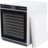 В комплектацию входят 10 стальных лотков, 9 поддонов с бортиками для жидких продуктов: пастила, хлебцы, 9 сетчатых листов.