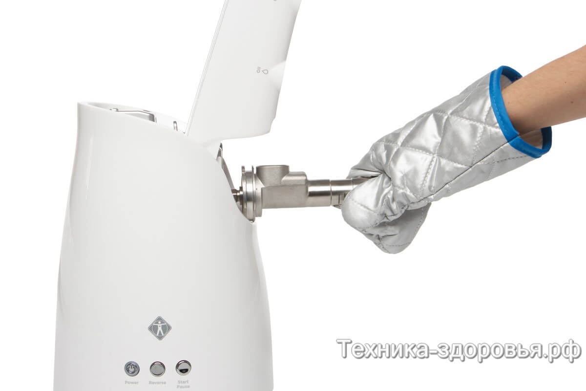 Для очистки достаточно снять лоток для загрузки, приподнять кожух, прикрывающий основной рабочий инструмент – это шнек-пресс, передвинуть замок в положение «Unlock» и вытянуть его. Промыть и почистить, и так же легко вернуть его на место.