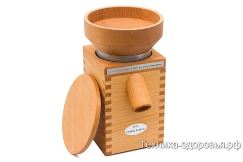 В бытовой мельнице Fidibus Classic объединены все достоинства мельниц KoMo. Корпус модели выполнен из букового массива, внутри установлен 360-ваттный мотор и фирменные корундовые жернова диаметром 85 мм. Основное предназначение KoMo Fidibus Classic – приготовление цельнозерновой и безглютеновой муки. Она измельчает злаки (пшеницу, ячмень, рожь), рис и гречку. Также аппарат можно использовать в качестве измельчителя для переработки кукурузы, бобовых культур, кофе и специй. В мельнице реализован простой способ изменения степени помола. Можно легко готовить муку сорта «Экстра» или муку с отрубями. Таким образом, современная бытовая мельница – это универсальное устройство.