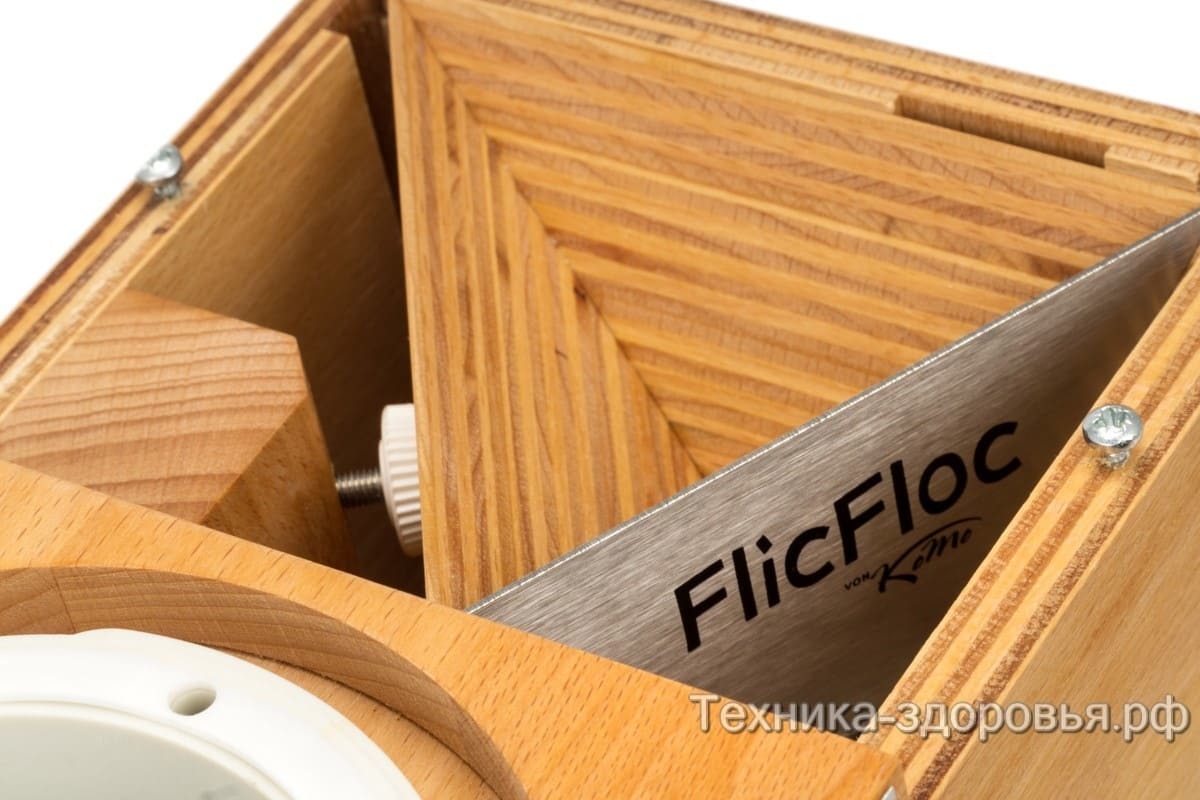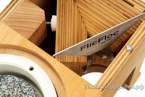 Основную режущую функцию выполняют каменные жернова, перетирающие зерна в муку и стальные прочные вальцы, способные раздробить зерно в хлопья при ручном воздействии. Жернова приводятся в действие при помощи электромотора мощностью 360 Вт, а вальцы, дробящие зерно для хлопьев, вращаются вручную, посредством специальной ручки, закрепленной сбоку корпуса мельницы. Без особых усилий, вращая ручку, можно приготовить до 100 г хлопьев в течение всего лишь одной минуты. В то же время, вращающиеся жернова за одну минуту способны перетереть зерно в муку самого тонкого помола.