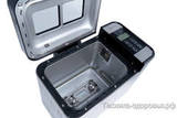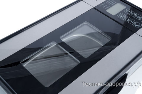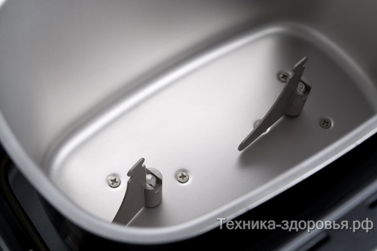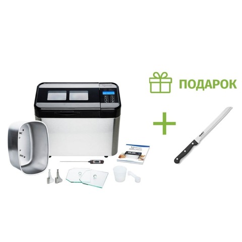 Хлебопечка компактная, прекрасно впишется в небольшую кухню. Корпус печки из нержавеющей стали, на крышки имеется прозрачное смотровое окошко. На дне корпуса прорезиненные ножки для надежной и устойчивой фиксации на столе. Контейнер для замеса теста и выпекания, а тка же 2 крыловидных тестомеса из нержавеющей стали.