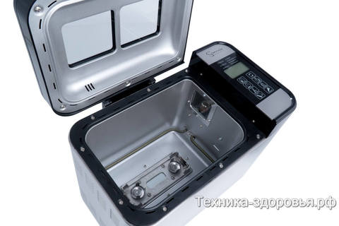 Оснащена пекарня 2 картами памяти, имеет 7 программных режимов с запоминанием часто задаваемых программ и отсрочкой (переносом старта) замеса теста и выпечки до 24 часов. С сенсорной жидкокристаллической панелью управления и температурными режимами от 20 до 230°С.