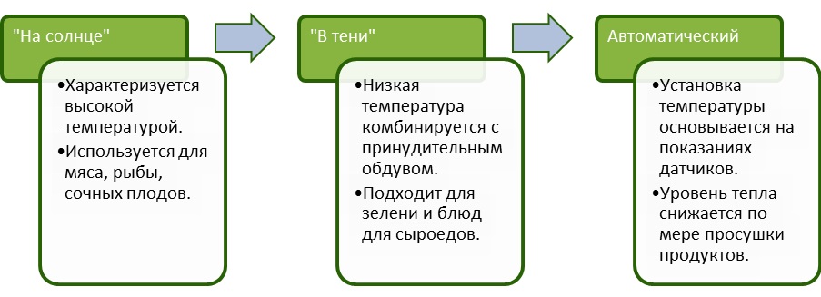 Инфракрасный дегидратор Lequip IR-D5 может работать в трех разных режимах. Он позволяет выбрать оптимальный вариант для конкретного вида продуктов.