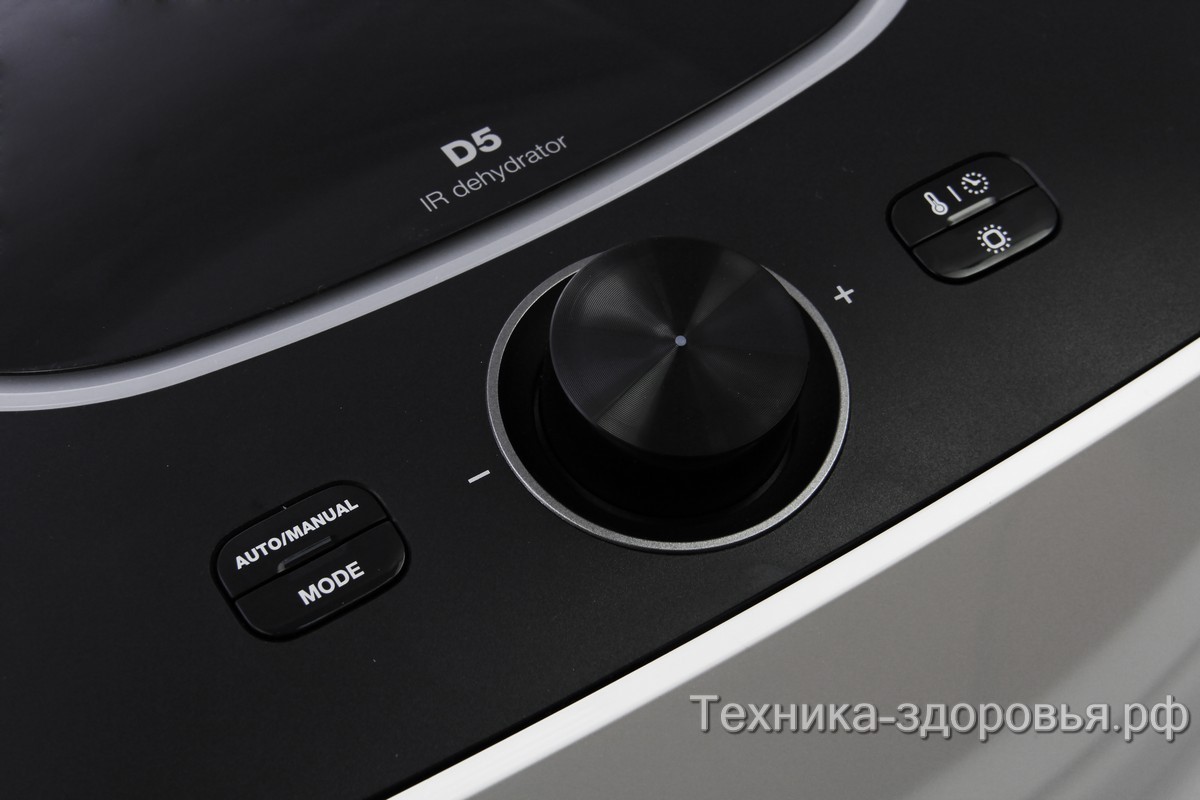 Дегидратор Lequip IR-D5 отличается необычным дизайном. Форма корпуса сочетает строгие геометричные линии и мягкие углы. Верхняя часть оснащена округлым регулятором, клавишами, зеркальным табло.