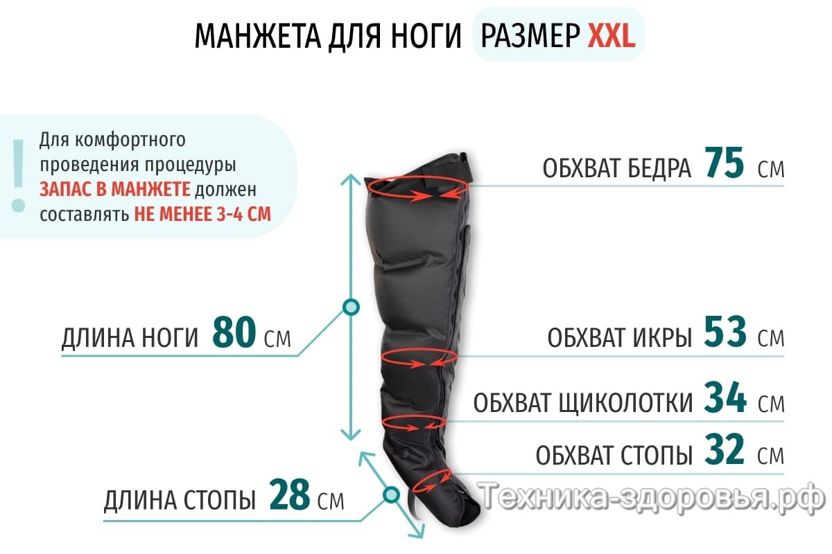 Манжеты для ног оснащены пятью независимыми камерами, которые обеспечивают плавную проработку каждой зоны ноги. Манжеты изготовлены из влагостойкого прочного износостойкого материала.