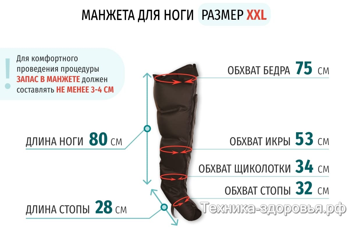 Манжеты для ног оснащены пятью независимыми камерами, которые обеспечивают плавную проработку каждой зоны ноги. Манжеты изготовлены из влагостойкого прочного износостойкого материала.