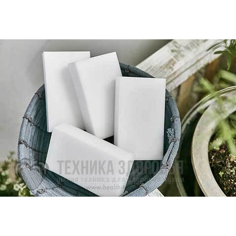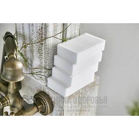 Меламиновая губка изготовлена из меламиновой резины - пластика нового поколения, который, подобно ластику, очищает сильные загрязнения на твердых поверхностях без применения химических средств.