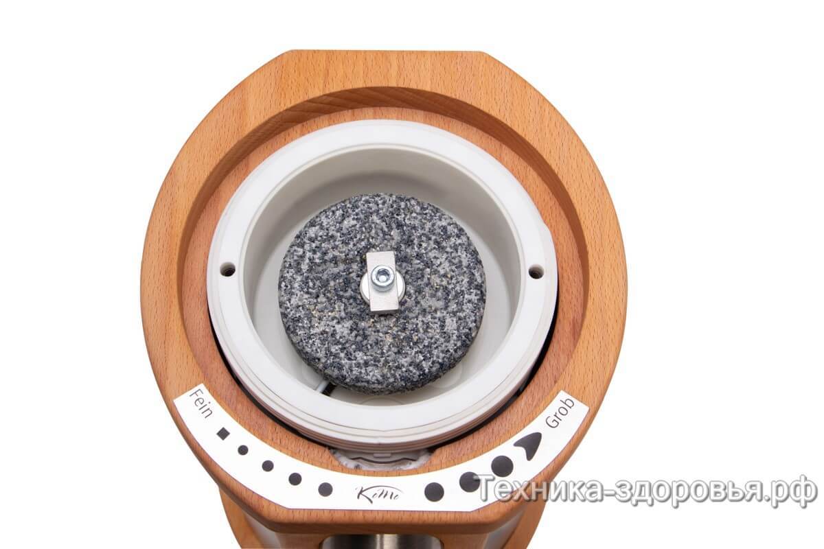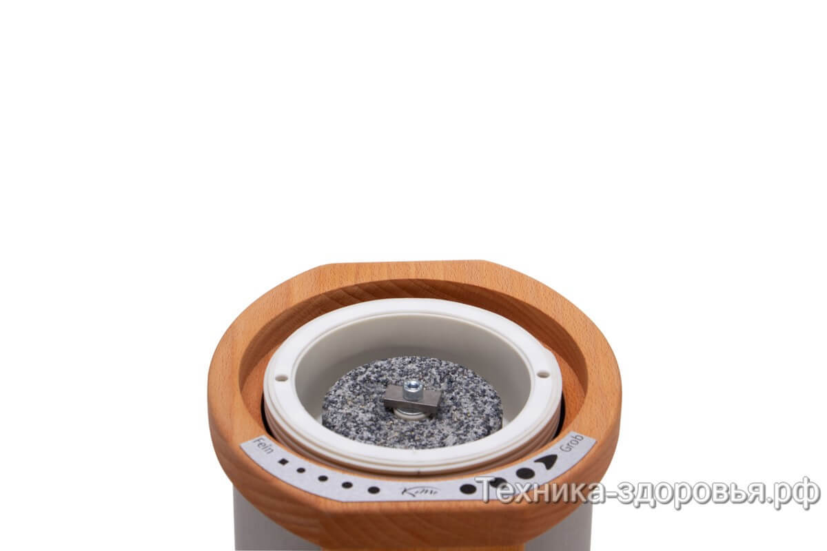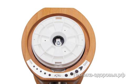 Уникальные жернова, разработанные компанией КоМо для бережного помола на малых оборотах, изготовлены из керамо-корундового сплава. Вам нужно только повернуть загрузочную корзину устройства на несколько градусов левее или правее для плавной настройки тонкости или крупности помола зерна. Регулировку помола можно производить как перед началом работы, так и в процессе.