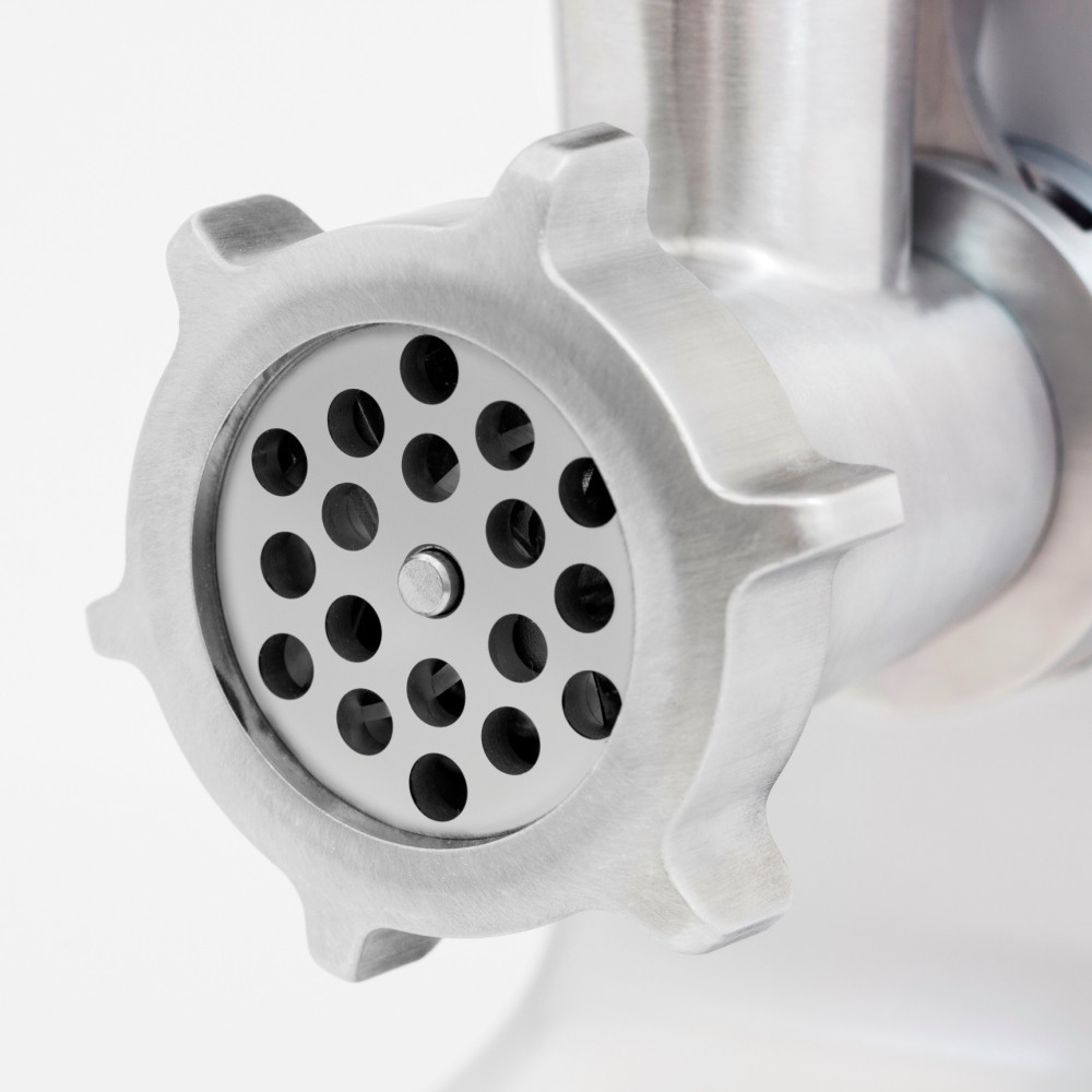 3 решетки из нержавеющей стали с отверстиями 3, 5 и 8 мм дают возможность приготовить фарш для самых разнообразных блюд. Толщина каждой решетки - 5 мм.