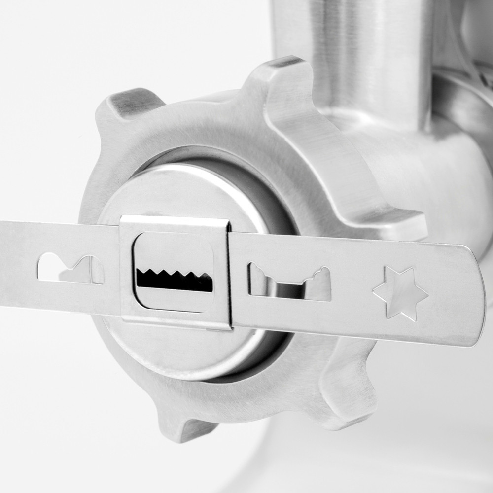 Мясорубка имеет 2 рабочих скорости, которые дают возможность обрабатывать мясо любой жесткости. А при помощи режима Реверс легко можно очистить шнек от остатка мяса и жил, которые наматываются во время работы мясорубки.