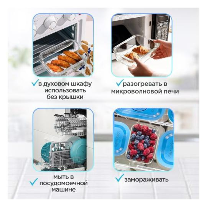 Нижнюю часть, которая изготовлена из стекла можно мыть в посудомоечной машине, разогревать в СВЧ, замораживать и даже готовить в духовке. Материал имеет очень широкий рабочий диапазон температур.