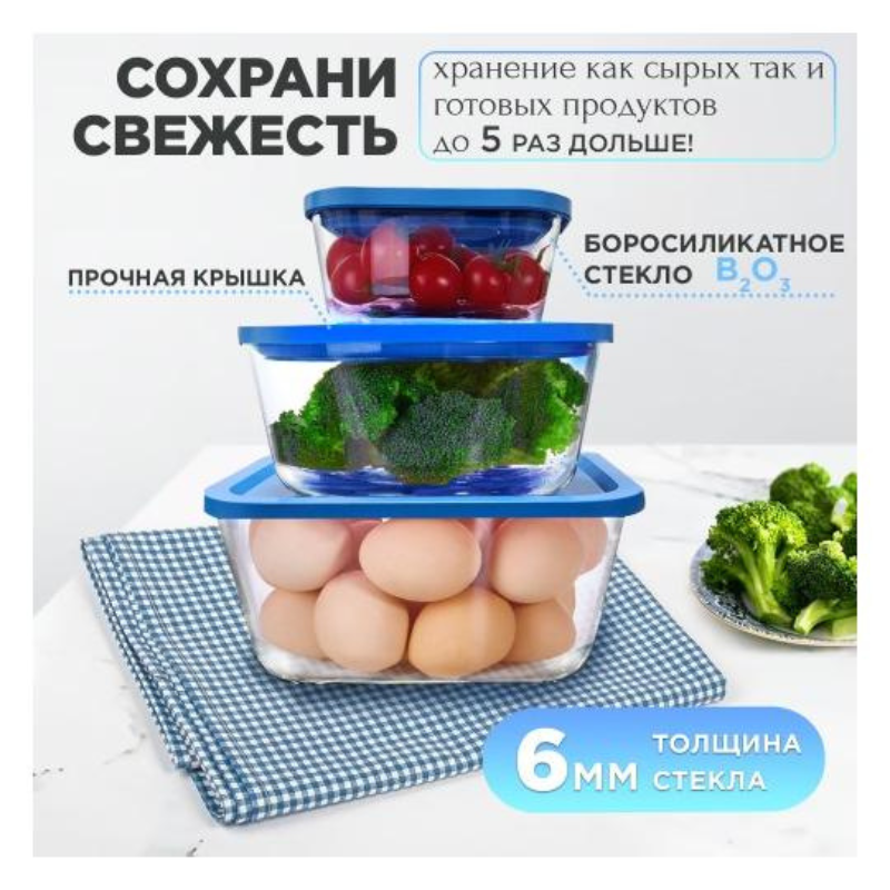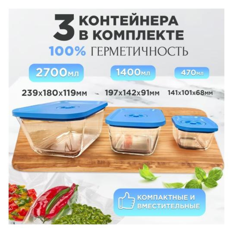 Набор состоит из трех вакуумных контейнеров разного размера. Вакуумные контейнеры изготовлены из термостойкого стекла.