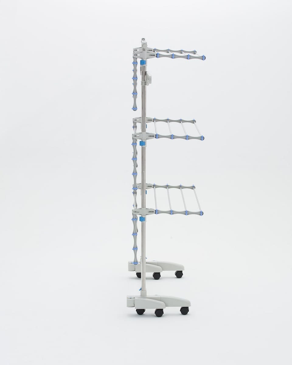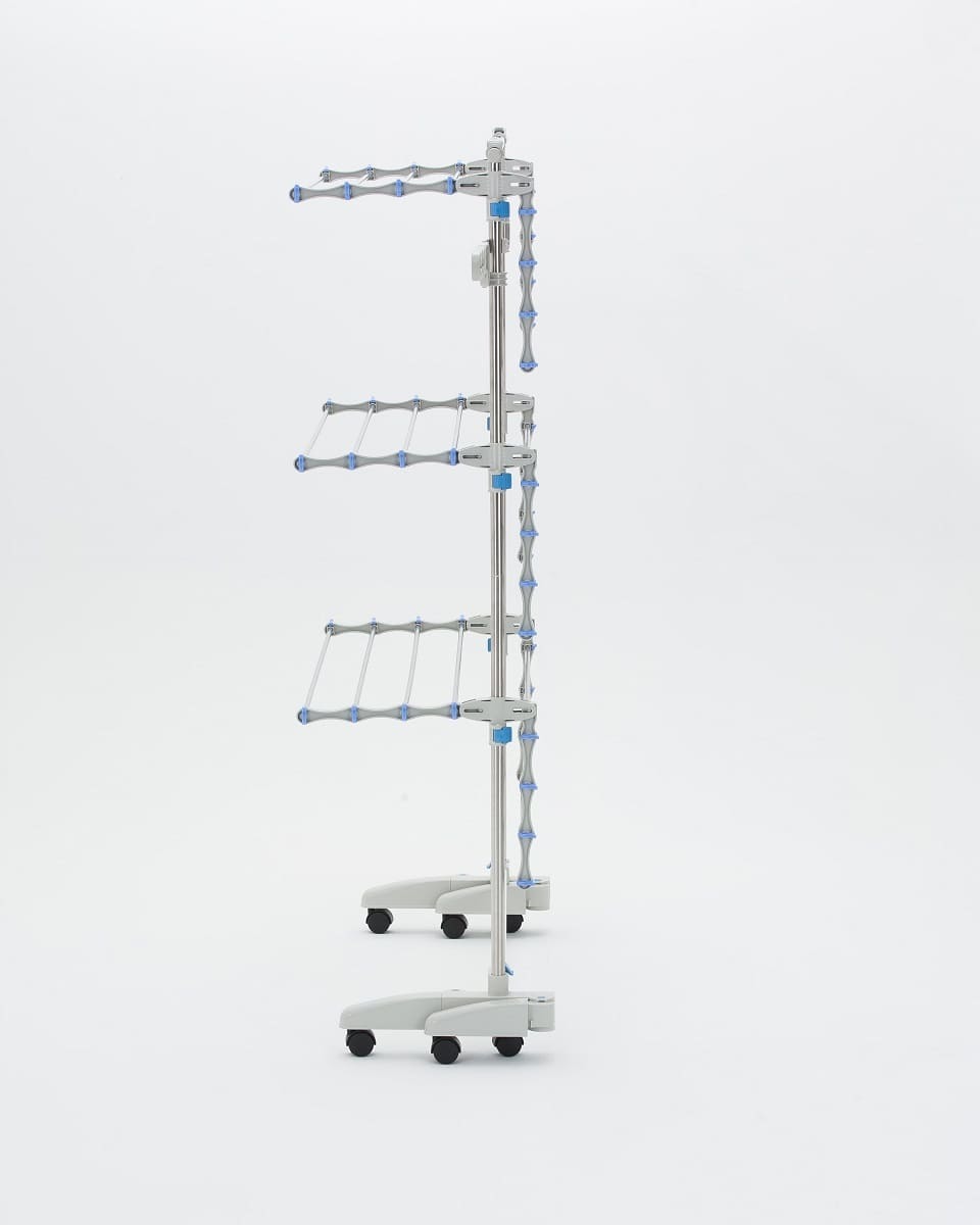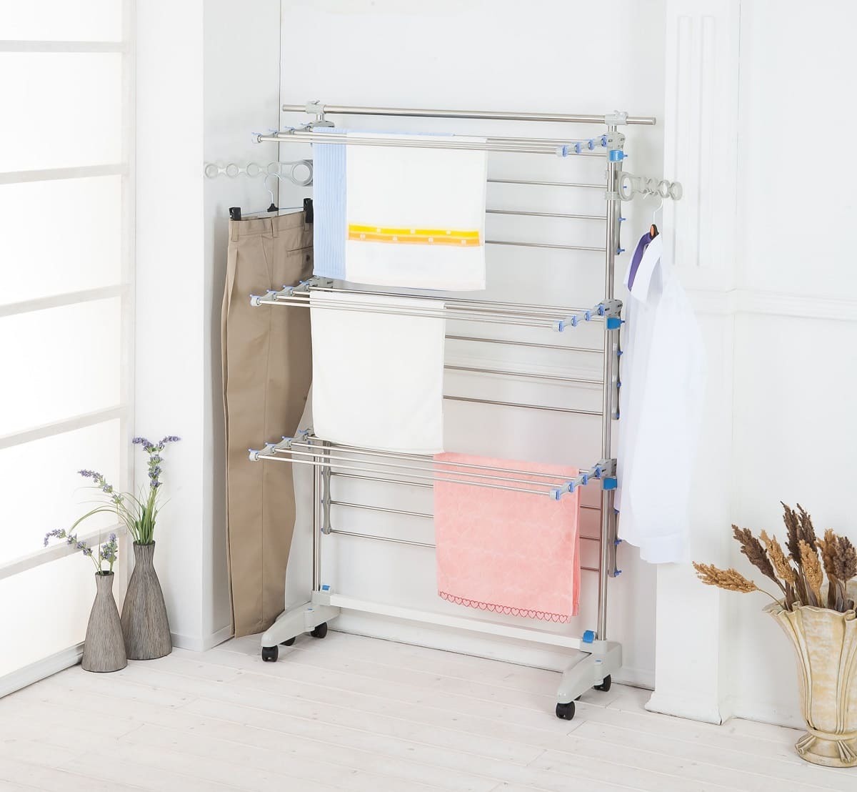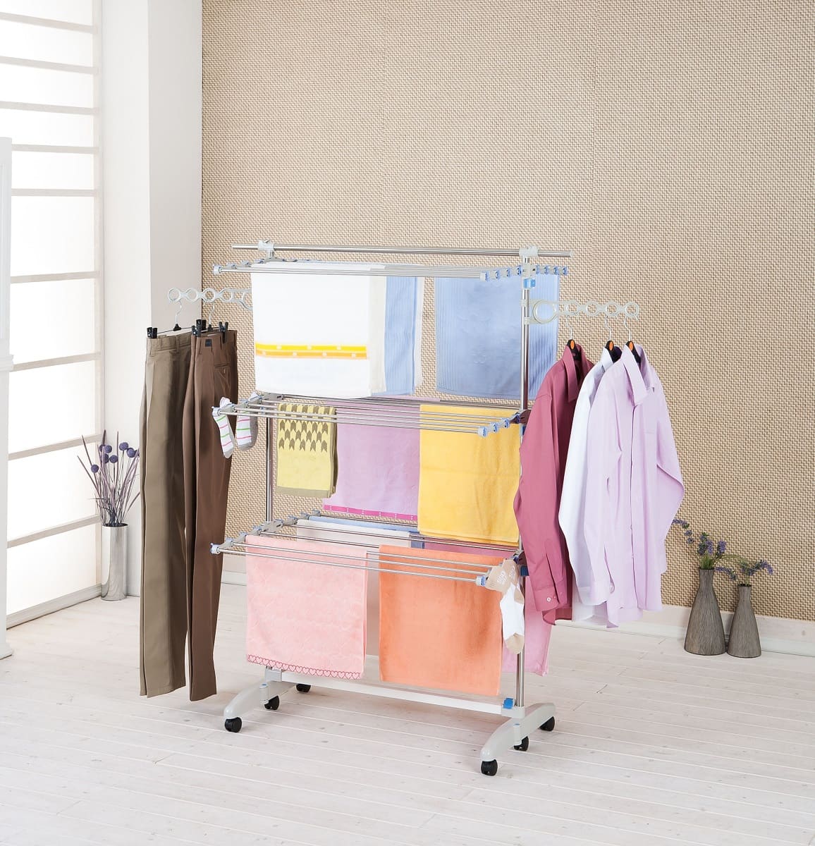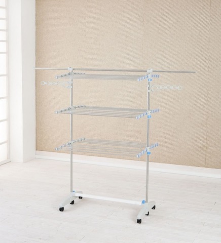 Компания Gochu предлагает металлическую 3-х уровневую напольную сушилку для белья Badoogi All Mom 3, покрытую пластиком, она складывается и экономит пространство дома. Сушилка устойчива и проста в использовании, выдерживает до 25 кг белья.