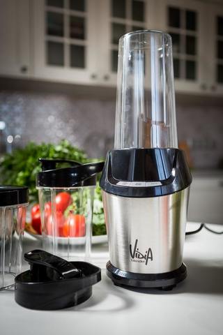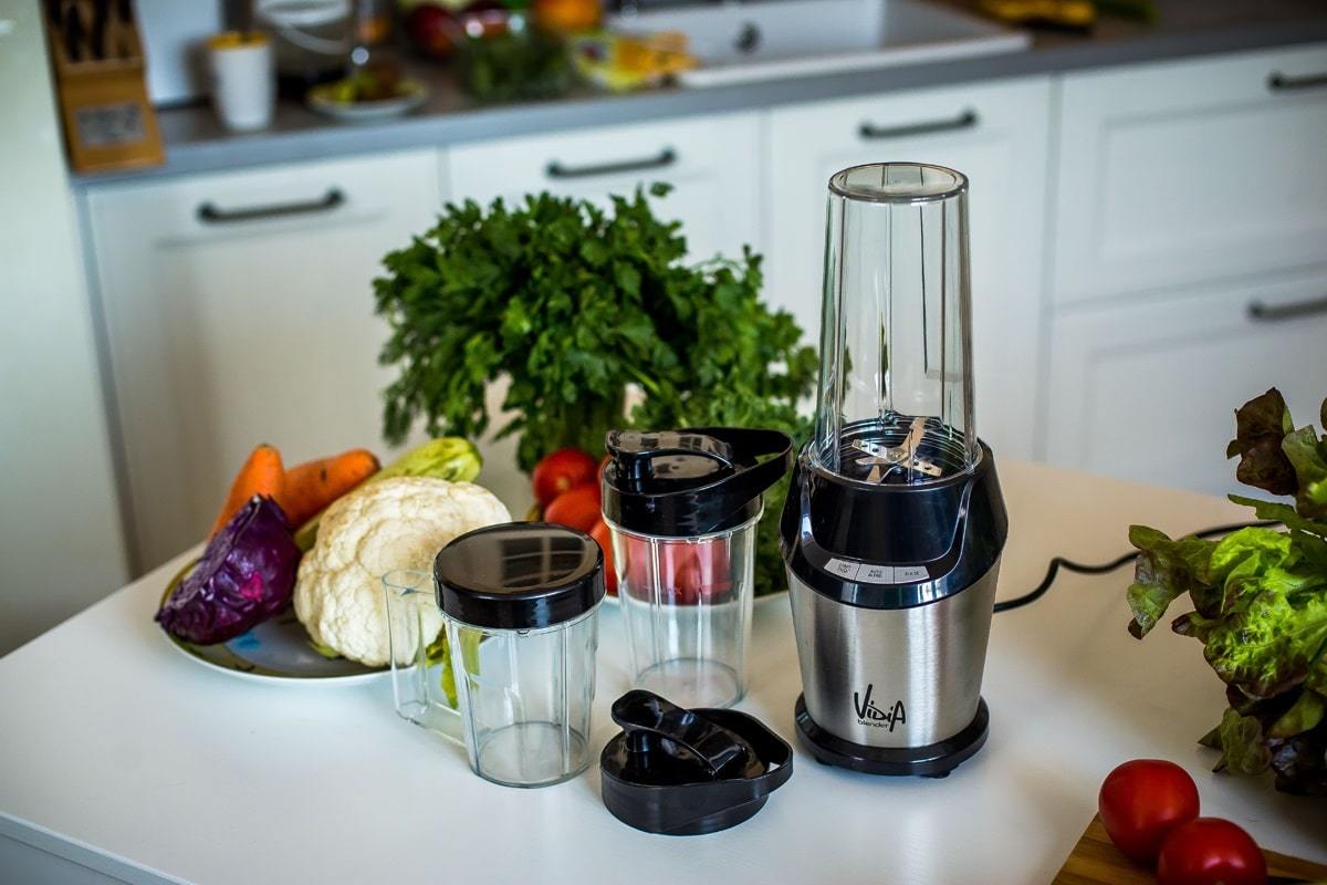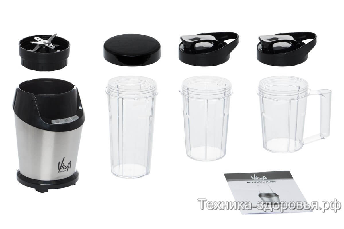 В базовой комплектации Vidia PBL-001 предусмотрено три стакана объемами 700, 500 и 350 мл. Используя разные ёмкости, можно приготовить смузи на двоих, сделать дневной запас белкового коктейля или измельчить порцию кофейных зёрен. Стаканчики комплектуются крышками, две из которых – походные.