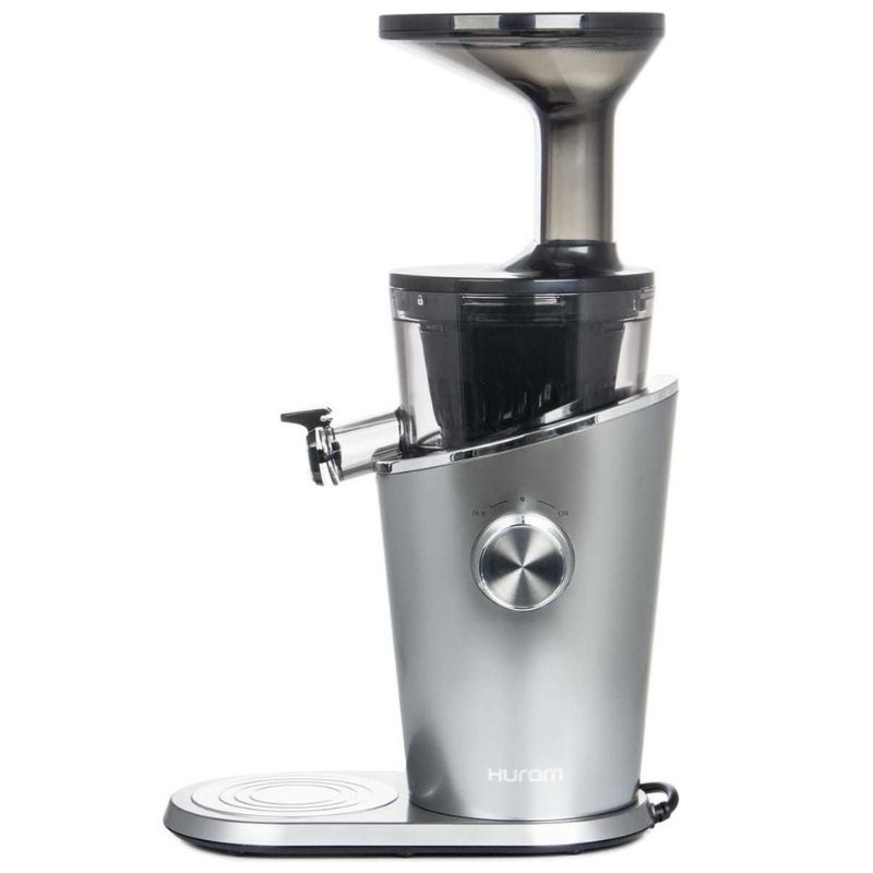 Вертикальная соковыжималка Hurom H-100 – новинка 2018 года. В отжимной корзине полностью отсутствует какой-либо металл. Вместо классического комплекта из сетки и обтирателя - в отжимной корзине используется набор из двух решеток, вставляющихся друг в друга. Форма отверстия для прохождения сока представляет собой вытянутые по вертикали арки. Благодаря такой форме, в сок попадает минимальной количество жмыха, а мойка аппарата после использования занимает меньше минуты и в большинстве случаев не требует применения щеток для чистки.