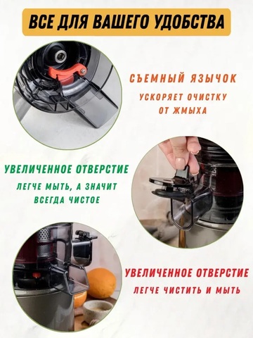 Широкая загрузочная горловина 150 мм — рекорд среди аналогичных соковыжималок. Больше не нужно нарезать продукты мелкими кусочками: крупные овощи и яблоки проходят легко и быстро.