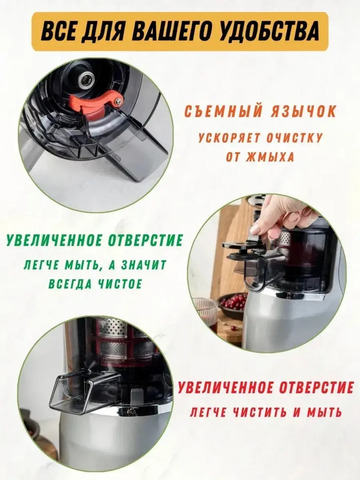 Эта соковыжималка создана для максимальной эффективности. В независимых тестах по выходу сока она обошла даже корейских лидеров рынка: из 1 кг моркови модель стабильно выдаёт 526–538 г чистого напитка. Для сравнения: конкуренты дают всего 360–480 г. Разница ощущается буквально в каждом стакане.