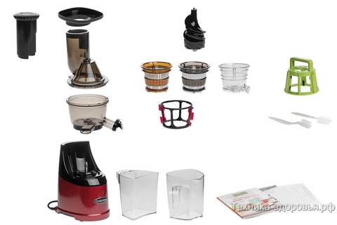 Низкая скорость кручения шнека в 60 об/мин позволяет получать сок холодного отжима. Двигатель мощностью 240 Вт может работать без остановки до 30 минут и без усилий успеет переработать до 15 кг любых качественных фруктов, овощей, зелени и ягод. А насадка измельчитель пригодится для получения ореховой пасты, мороженного из замороженных фруктов и сырых овощных и фруктовых каш и сорбетов.