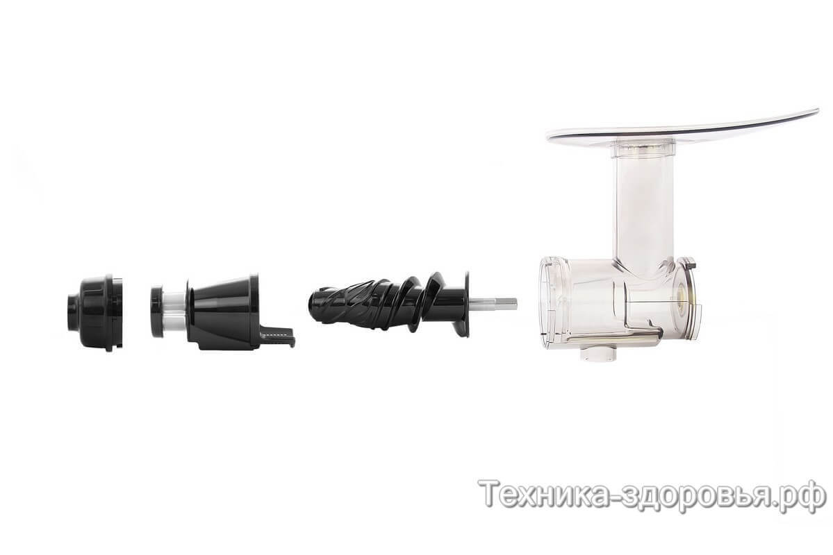 Хорошая устойчивость. Корпус располагается на четырех ножках с большой площадью опоры, поэтому шнековая соковыжималка Sana EUJ-707 сохраняет горизонтальное положение, даже если владелец с усилием проталкивает бруски моркови и ананаса.