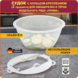 Держатель для овощерезок и терок "PRIMA" в виде кольца легко устанавливается на судок и фиксируется защелками.