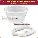 В комплекте: большая емкость для нарезания, хранения и сервировки объемом 4 л и пластиковый держатель "Multiplate" для терок и овощерезок.