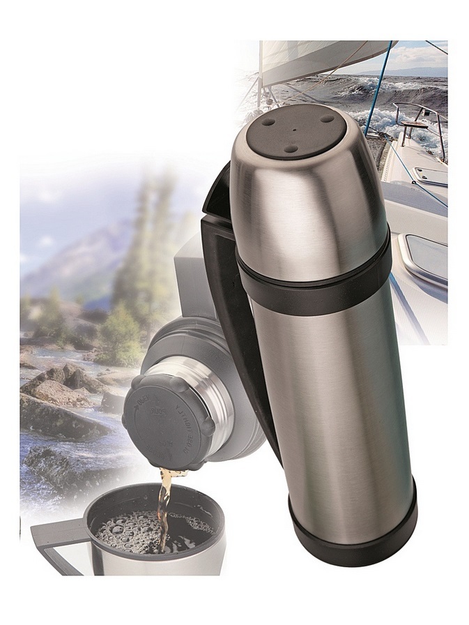 Термос из нержавеющей стали Augustin Welz - объемом 1 литр серебристого цвета с пластиковыми вставками и узким горлышком 5 см. Термос очень компактный, его можно поместить в сумку, рюкзак, или подлокотник в машине, брать с собой на работу, на тренировку или отдых.