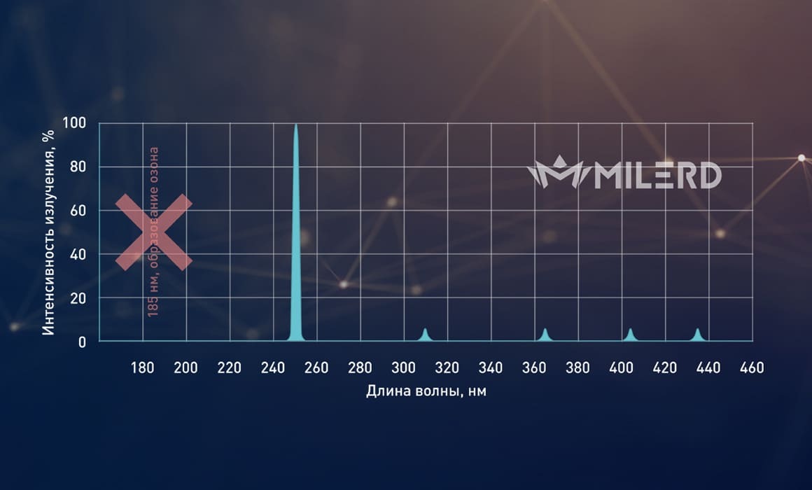 В приборе используется безозоновая УВ-С бактерицидная лампа из увиолевого стекла. Бактерицидная обработка ультрафиолетом происходит за счет излучения воздуха, проходящего через прибор.