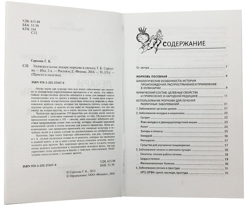 Читателям предложены 339 рецептов для лечения очень многих заболеваний с помощью моркови и свеклы, из них 236 рецептов по применению моркови и 103 - свеклы, дано описание лечебного действия пророщенных семян этих культур, которые обладают огромной жизненной силой и очень полезны для нашего организма. Даны рекомендации, как правильно применять эти овощные культуры в лечебных целях, и в каких случаях не рекомендовано их употребление.