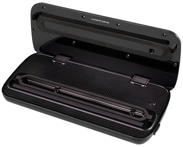 Корпус вакууматора выполнен из черного глянцевого пластика высокого качества. Снизу можно увидеть резиновые ножки, препятствующие скольжению. По бокам расположены подпружиненные кнопки, фиксирующие крышку устройства.