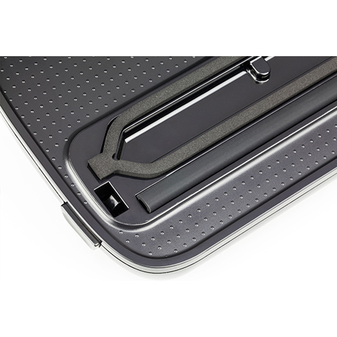На этой панели расположен логотип Caso, пять сенсорных кнопок, имеющих встроенную подсветку, индикаторы выбора режима, а также большой горизонтальный индикатор работы. Единственное, что нас смутило: разные цвета подсветки. Индикаторы режимов и кнопки подсвечиваются белым цветом, а индикатор работы, имитирующий «прогресс бар» подсвечивается ярко синим цветом, который, на наш взгляд, совершенно неуместен в черно-сером дизайне прибора и выбивается из общего ряда. Впрочем, на этом наши претензии к внешнему виду устройства заканчиваются.